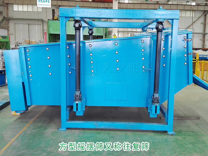 方型搖擺篩又稱往復篩,其驅(qū)動裝置所產(chǎn)生的振動力是一繞定軸、方向呈一定規(guī)律變化的慣性力,其本質(zhì)是由偏心輪繞定軸轉(zhuǎn)動所形成的往復慣性力。篩機啟動后,篩機搖動體即篩箱在慣性力的作用下作前后往復運動,篩箱帶動篩面作周期性搖動,從而使篩面上的物料隨篩箱一同作定向跳躍式運動,期間,小于篩面孔徑的物理通過篩孔落到下層,成為篩下物,大于篩面孔徑的物料經(jīng)連續(xù)翻滾跳躍運動后從排料口排出,完成篩分工作。