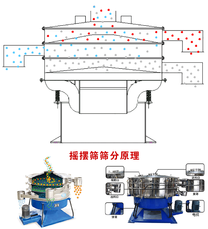搖擺篩是輕微的橢圓搖擺運動,不存在高速振動,對物料影響很小,不會破壞物料形狀,大大提高了物料的成品率。