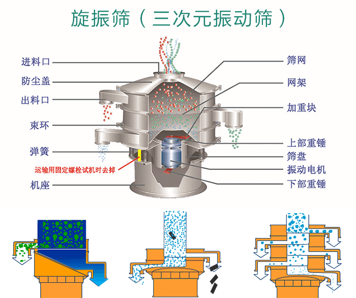 旋振篩是由電機提供振動源,從進料口投入物料,在振動狀態(tài)下穿過篩網直到出料口;防塵蓋、束環(huán)是為振動篩提供封閉狀態(tài)的。