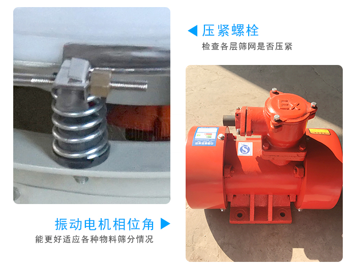 ⑸調(diào)節(jié)振動電機(jī)上下偏心塊的相位角,以適應(yīng)各種物料篩分情況。